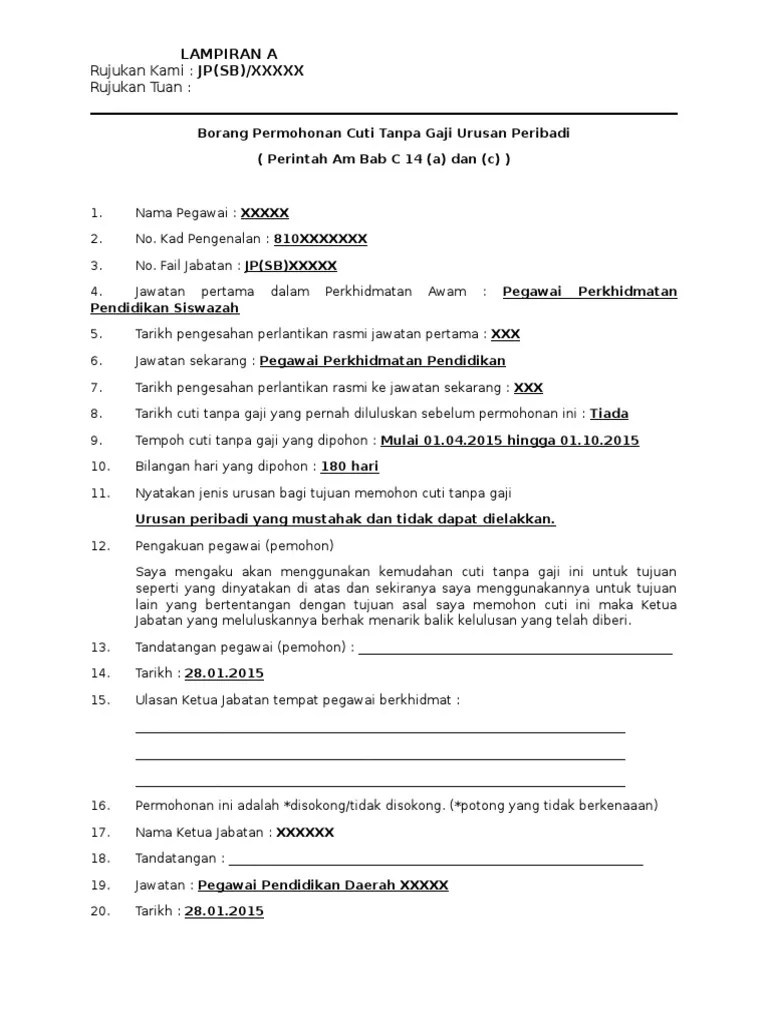 Surat Mohon Cuti Tanpa Gaji : Contoh Surat Rasmi Memohon Cuti Kerja Tanpa Gaji Kabar Blok Cuitan Dokter. The modifmobilz.com team also supplies the picture in top quality resolution (hd quality) that can be downloaded by simply way. Pengetua, smk taman jati, taman jatila, peti surat 123, 903. Permohonan contoh surat cuti tanpa gaji cuti tanpa gaji adalah permohonan yang dipohon oleh pekerja disesebuat syarikat atau penjawat awam . Borang permohonan cuti tanpa gaji.